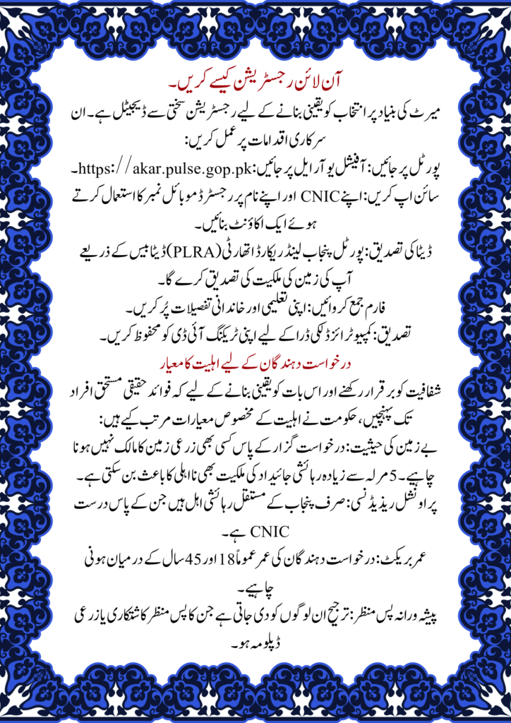 - Landless Status: The applicant must not own any agricultural land. Ownership of more than 5 marlas of residential property may also lead to disqualification.