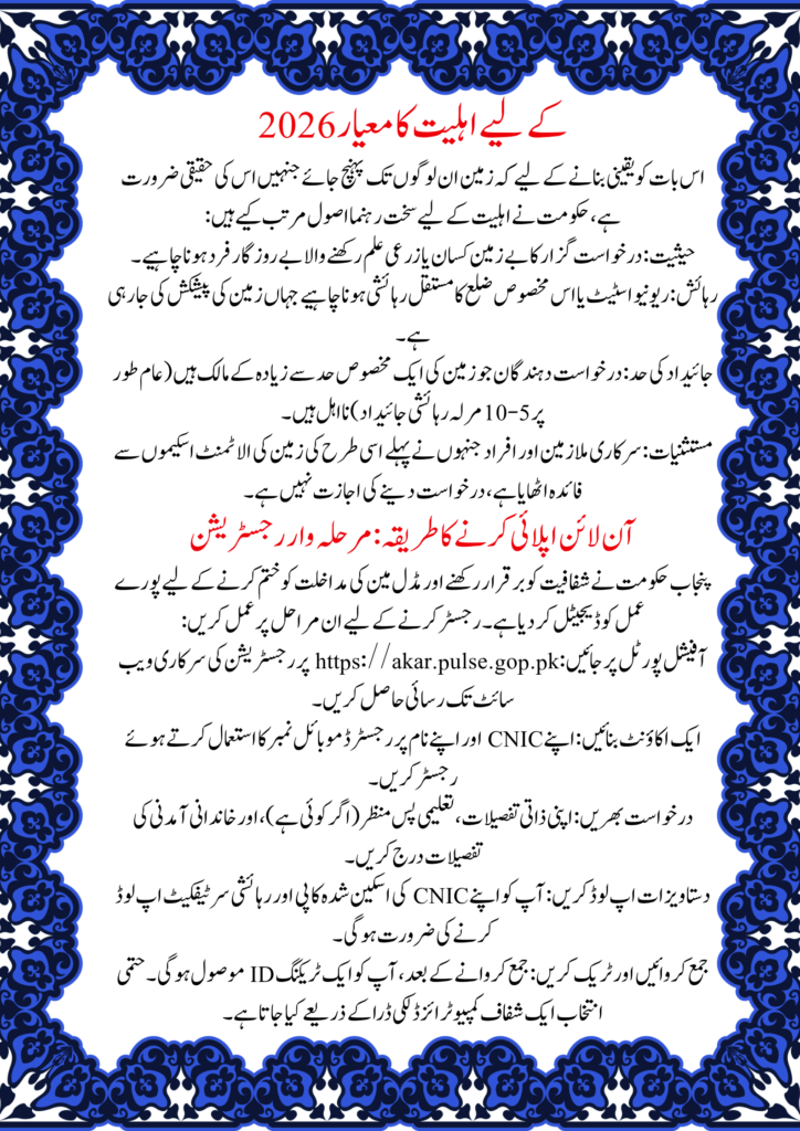In 2026, the agricultural sector remains the backbone of Pakistan’s economy. Recognizing this, the Punjab government has allocated approximately 250,000 acres of state land for the “Apna Khet Apna Rozgar” project. Unlike traditional land reforms, this program focuses on a 10-year lease model, allowing deserving individuals to cultivate land without the burden of high purchase costs or exploitative private rents. This scheme is a revolutionary step toward making the “Kissan” (farmer) self-sufficient and technologically advanced.